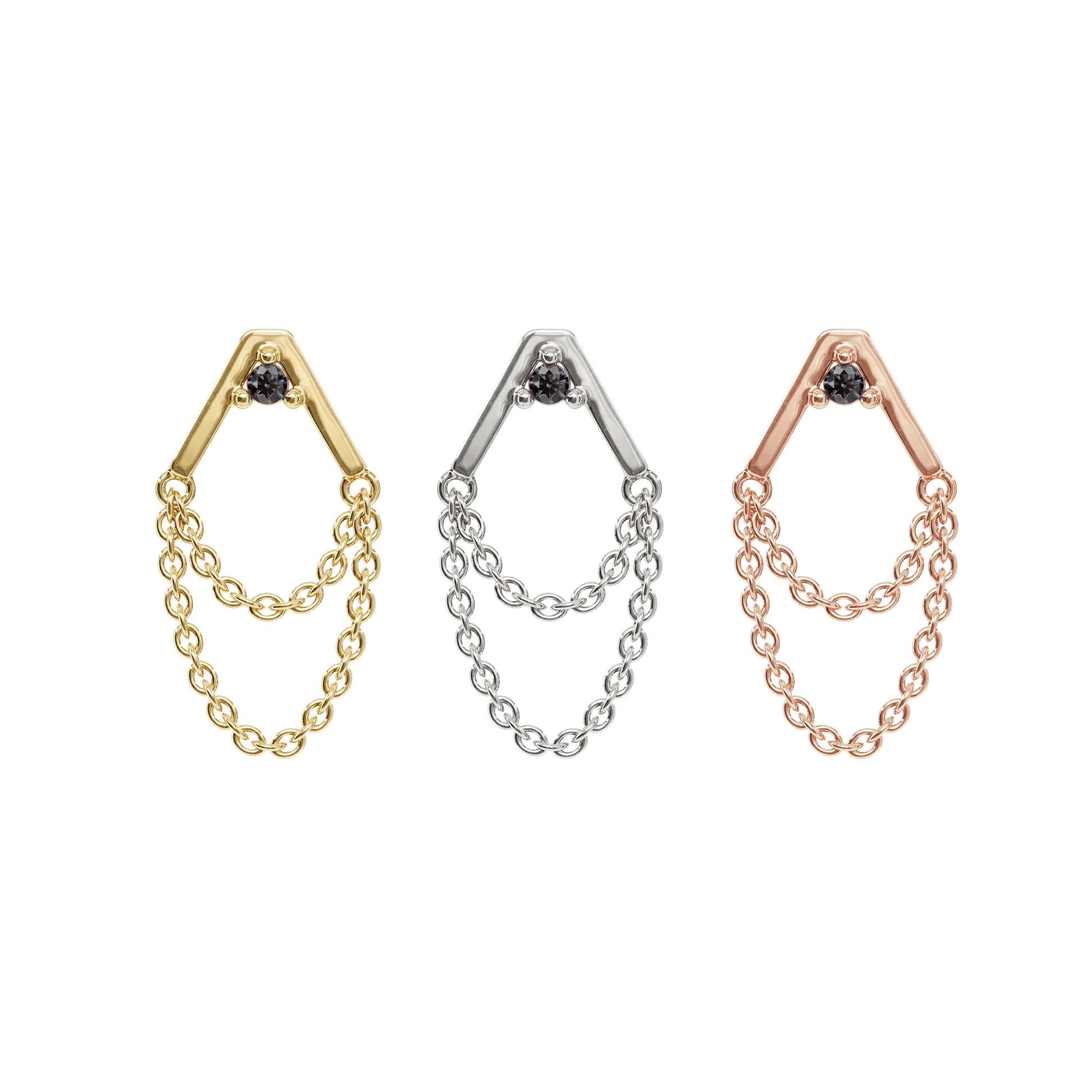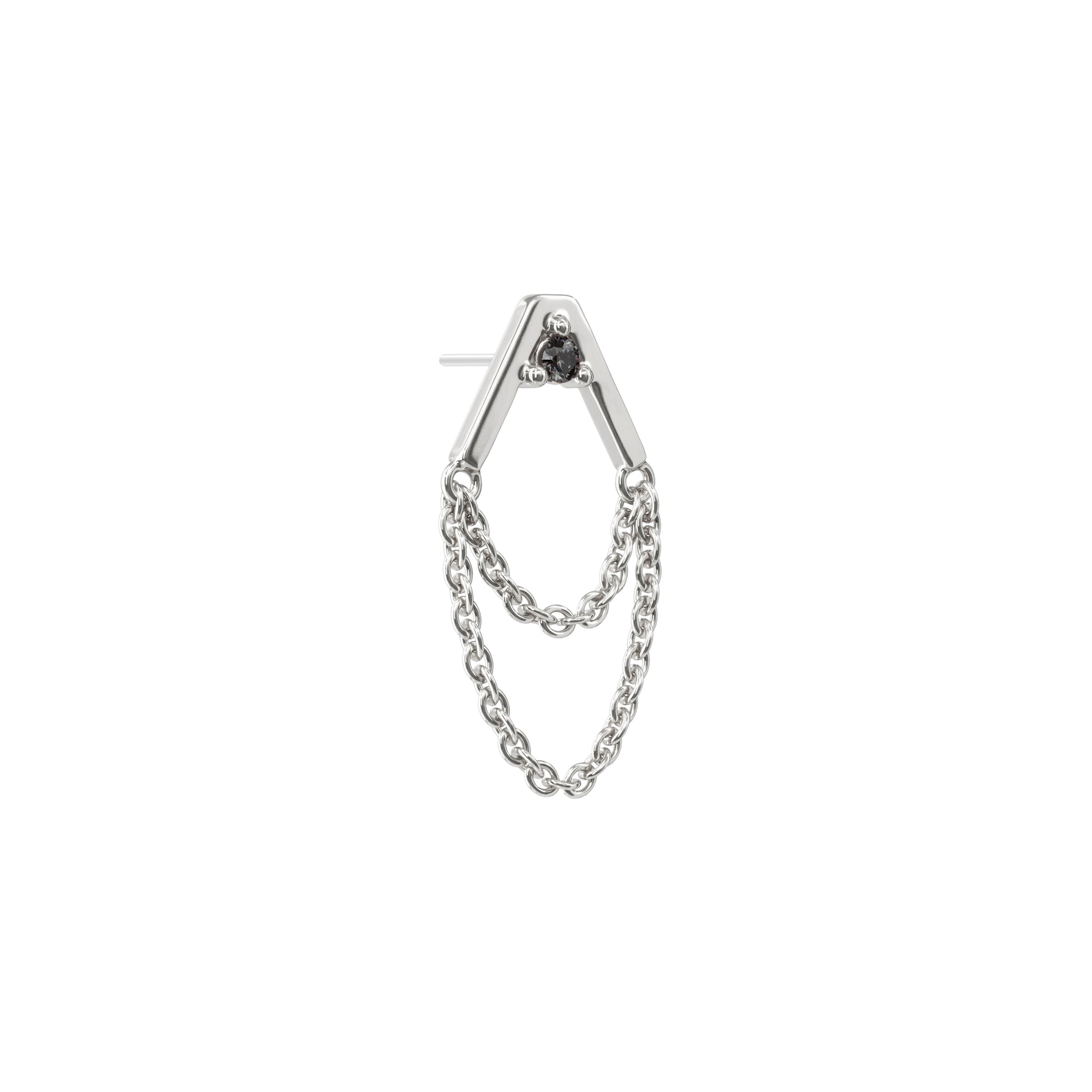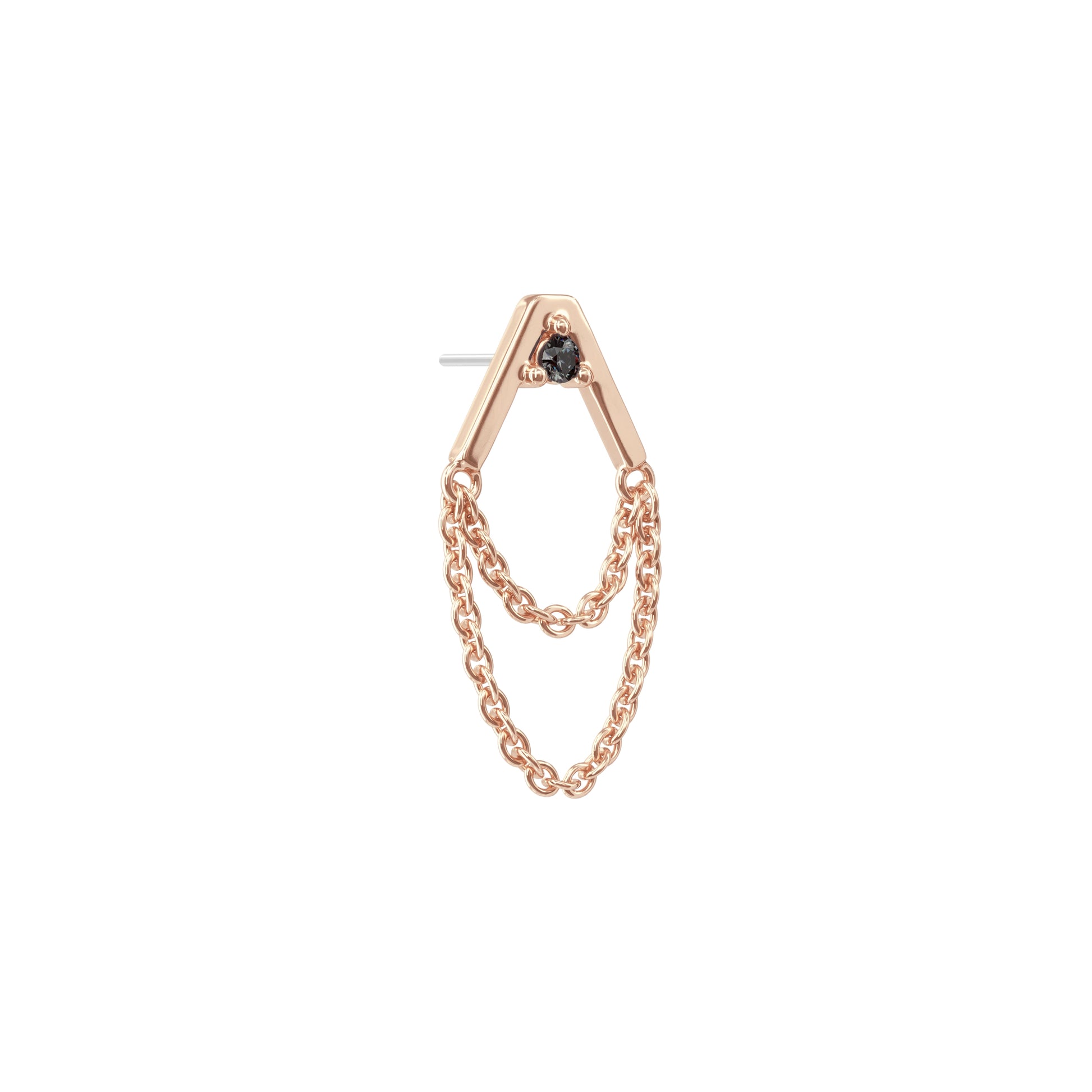 A 14k solid gold stud featuring a v-shaped design with a prong-set black diamond and two dangling chains.