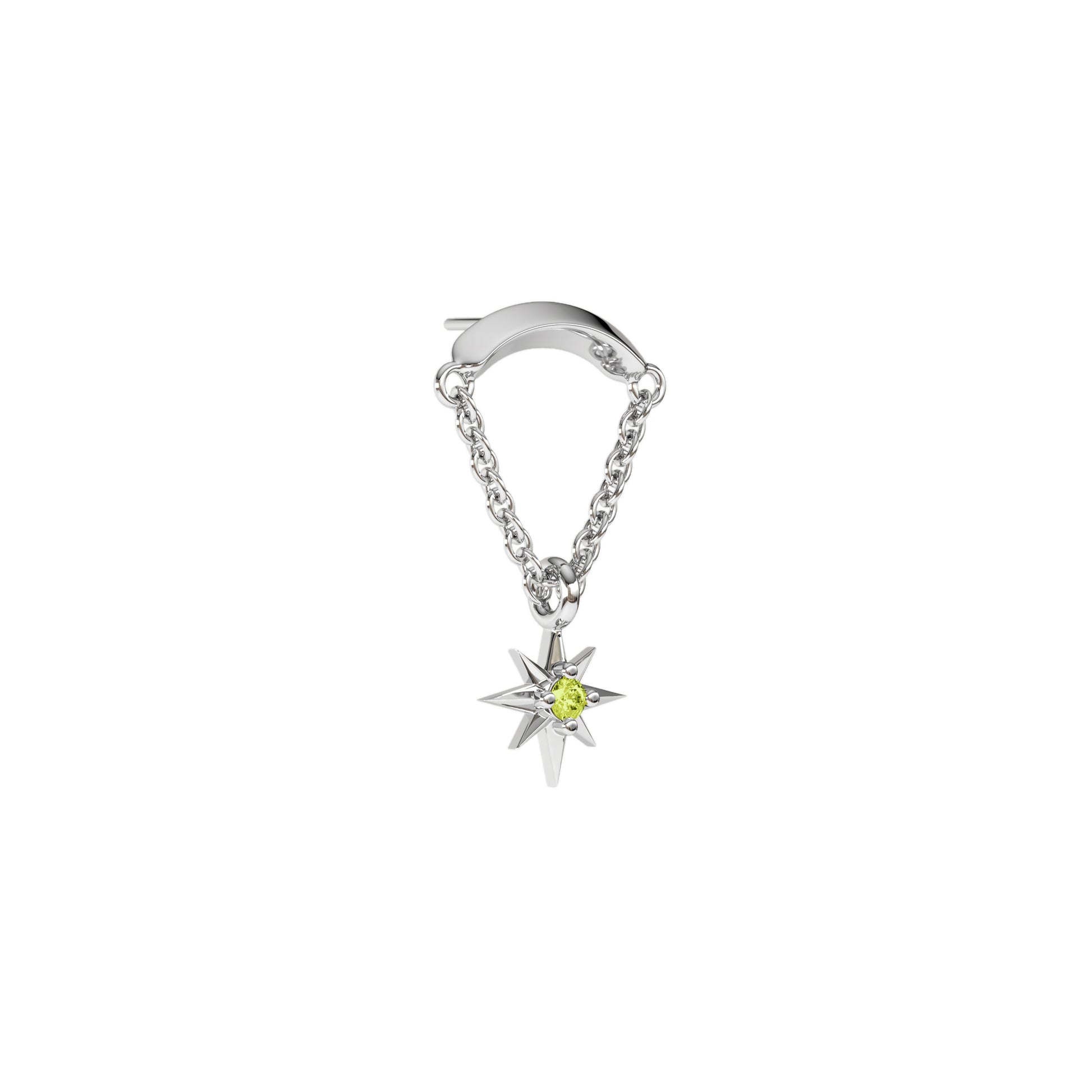 A 14k solid gold stud featuring a peridot starburst design on a dangling chain.