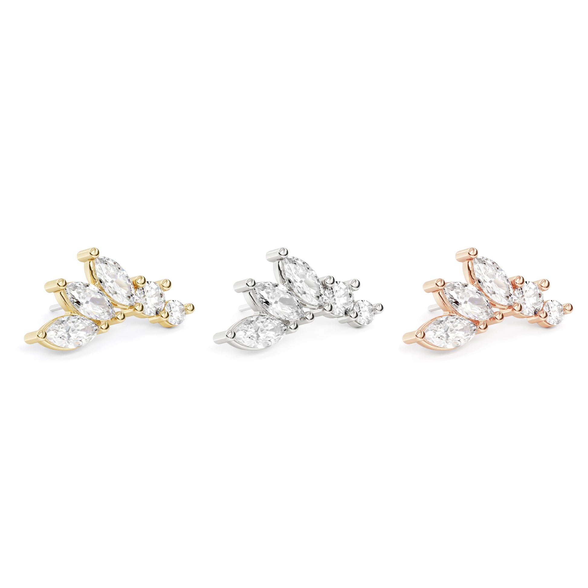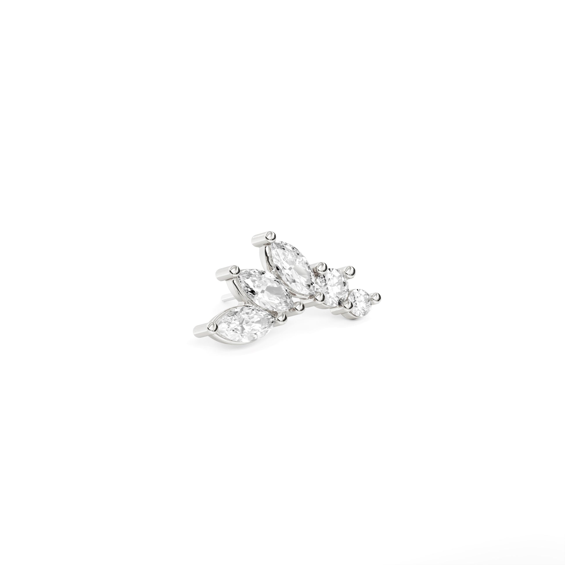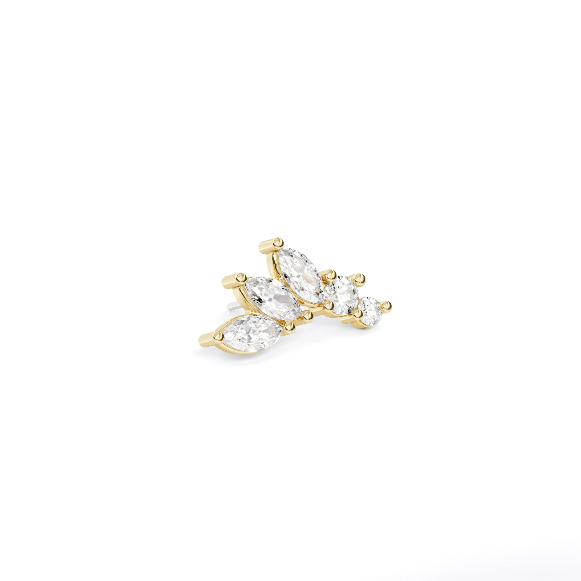 A 14k solid gold stud featuring a mix of round and marquise white diamonds in different sizes.