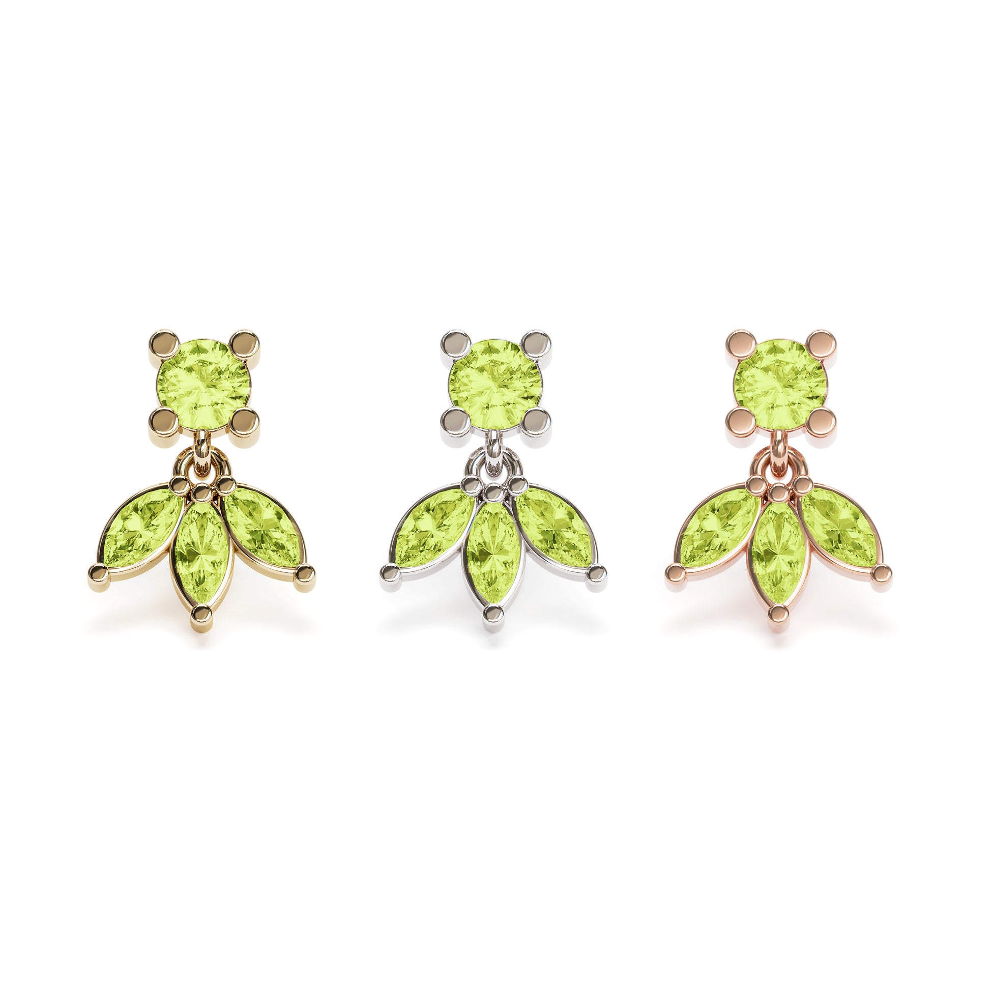 A 14k solid gold lotus stud with a prong-set round peridot and a trinity of marquise peridot gemstones which dangle down.