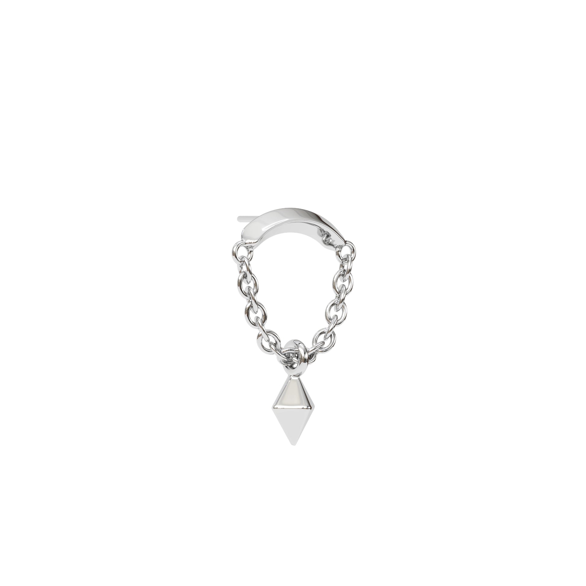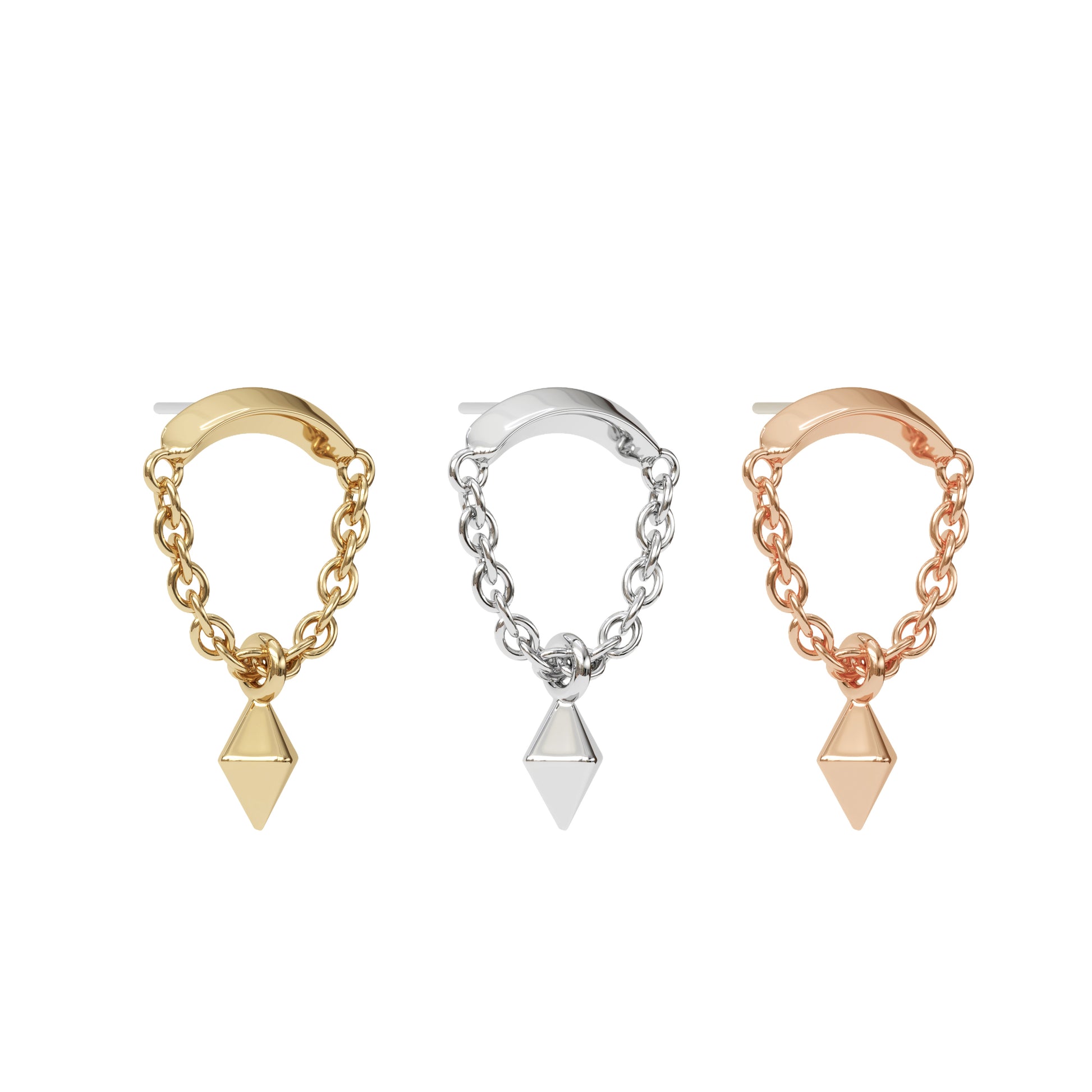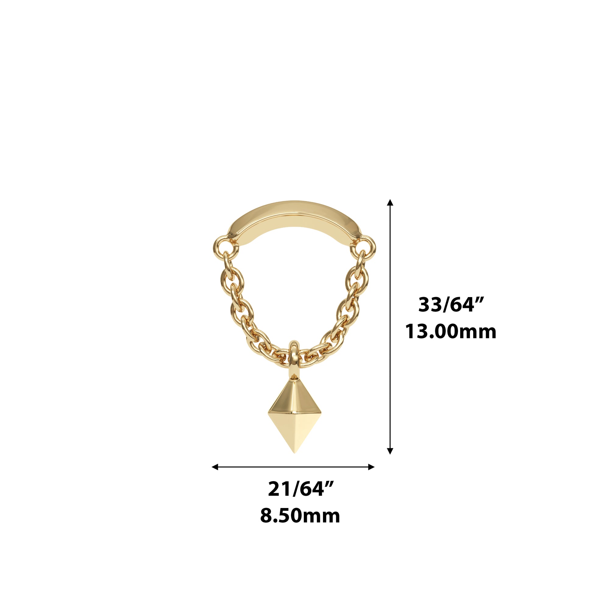 A 14k solid gold stud featuring a charm with a unique pyramid design on a dangling chain.