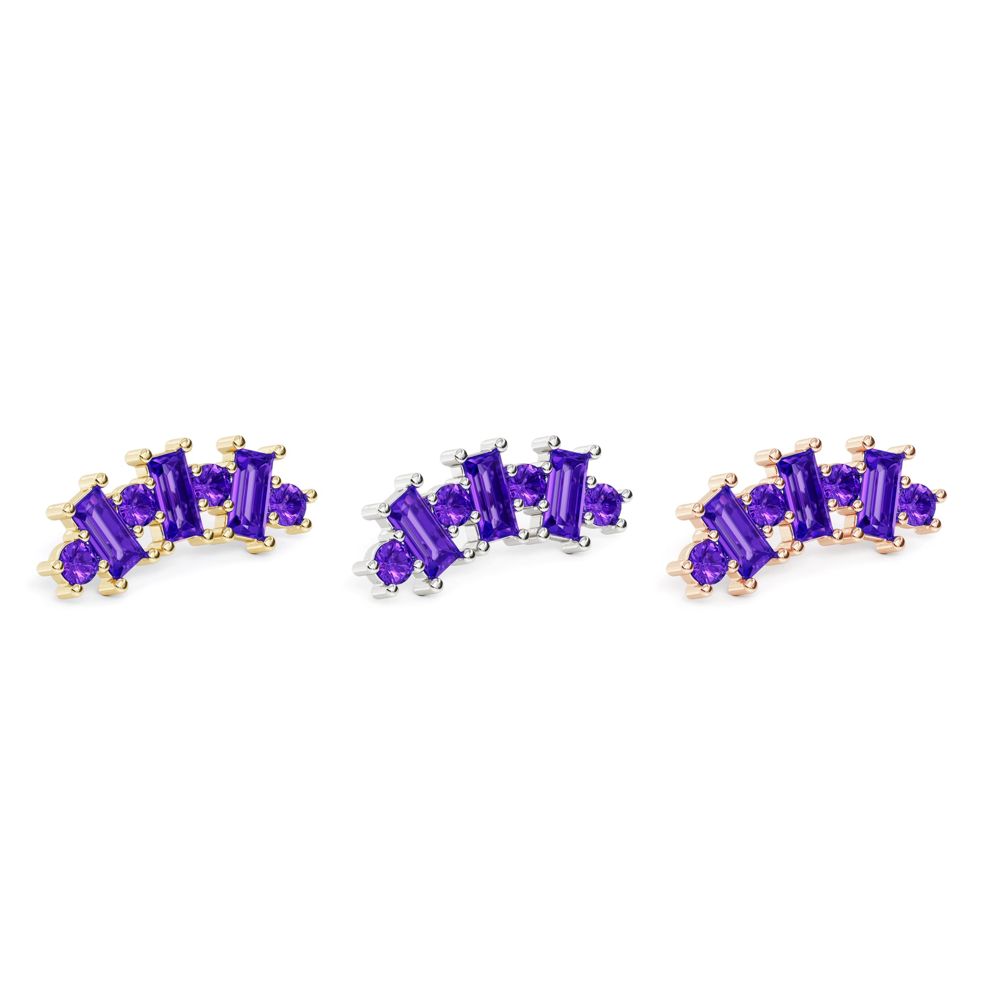 A 14k solid gold stud featuring a mix of round and baguette amethyst stones.