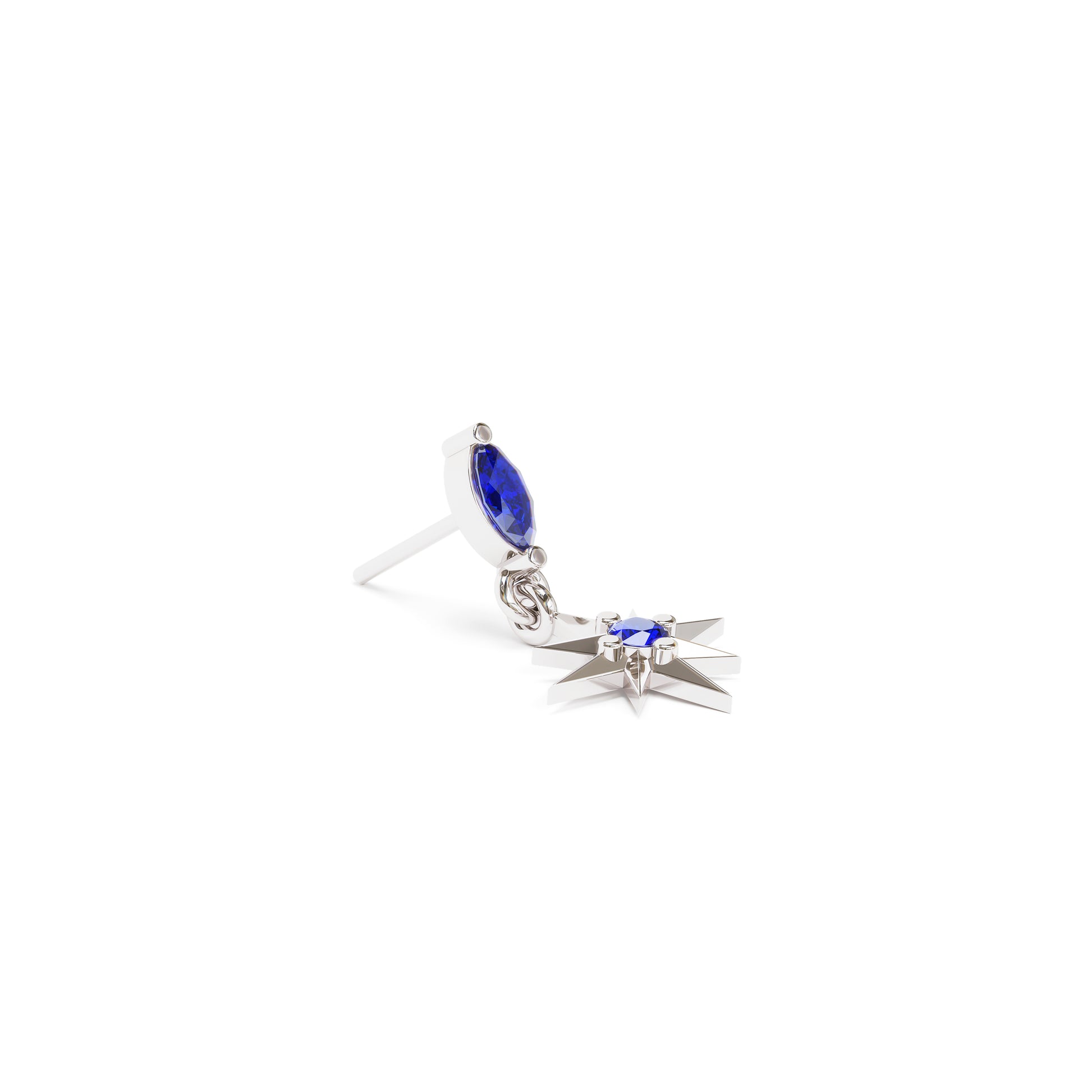 A 14k solid gold stud featuring a prong-set marquise sapphire and a sapphire starburst dangle.