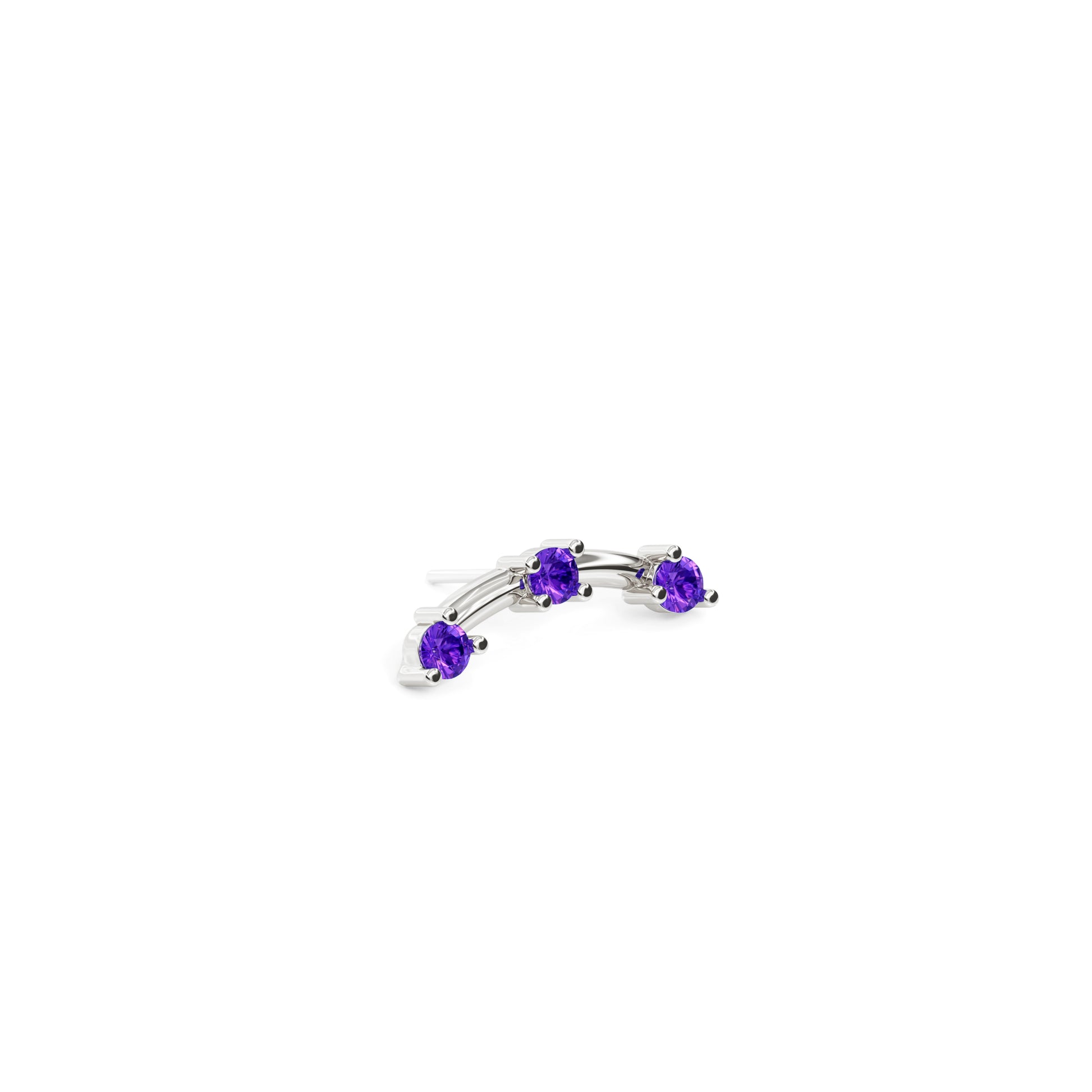 A 14k solid gold stud featuring three round amethysts in a curved shape in a sleek prong setting.